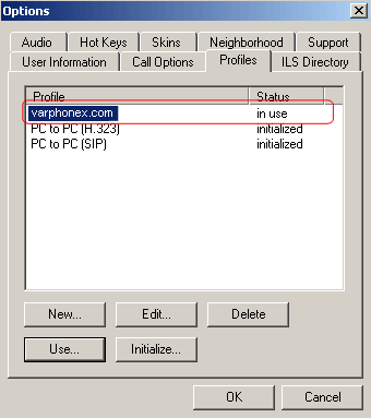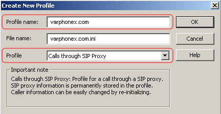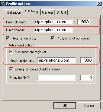 A 'Profile options' windows will appear. Click on the SIP Proxy Tab. Enter in 'Proxy Domain:' sip.varphonex.com and enter 5060 in the field to the right side of it. Under 'User domain:' enter sip.varphonex.com. In the same SIP Proxy Tab's Advanced options, put a checkmark on Use separate register. Under this enter in 'Register domain:' sip.varphonex.com and enter 5060 in the field to the right side of it. Click OK. |